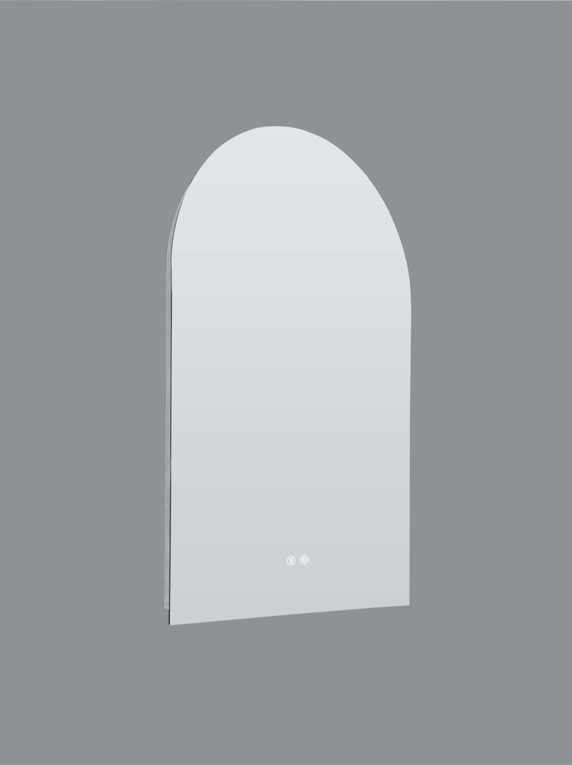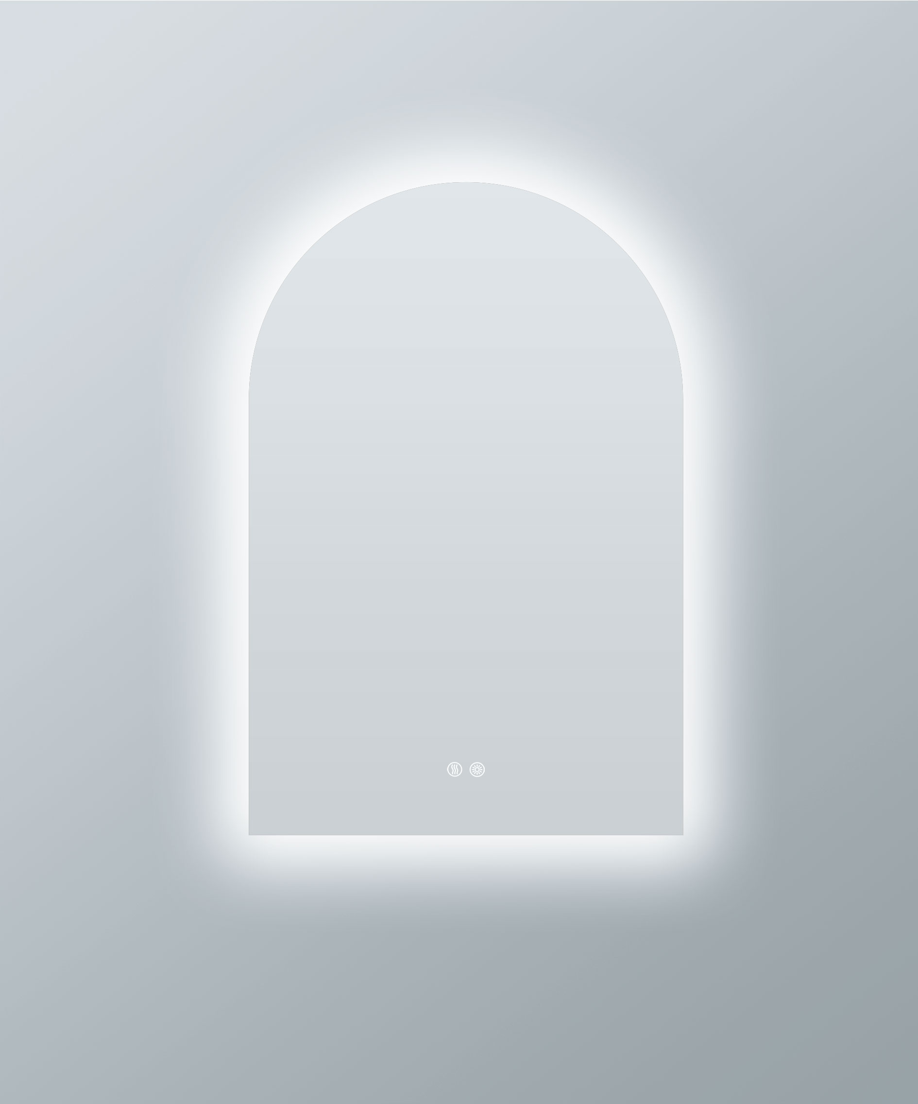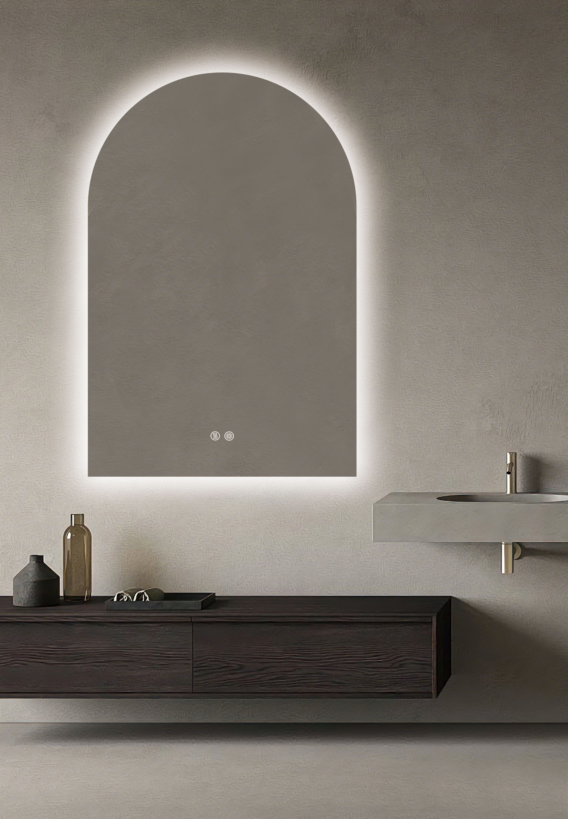 An arched silhouette rises gently from the wall, softened by a halo of backlight.