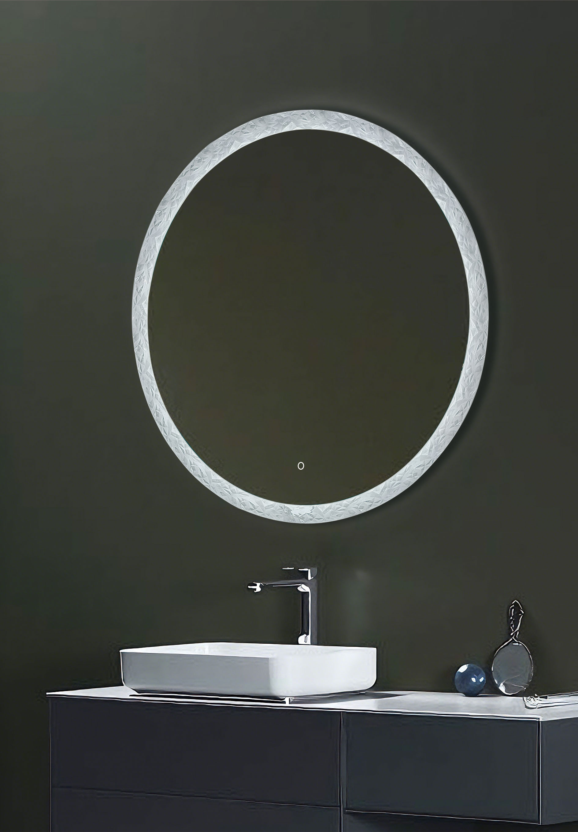 The faceted acrylic perimeter captures illumination