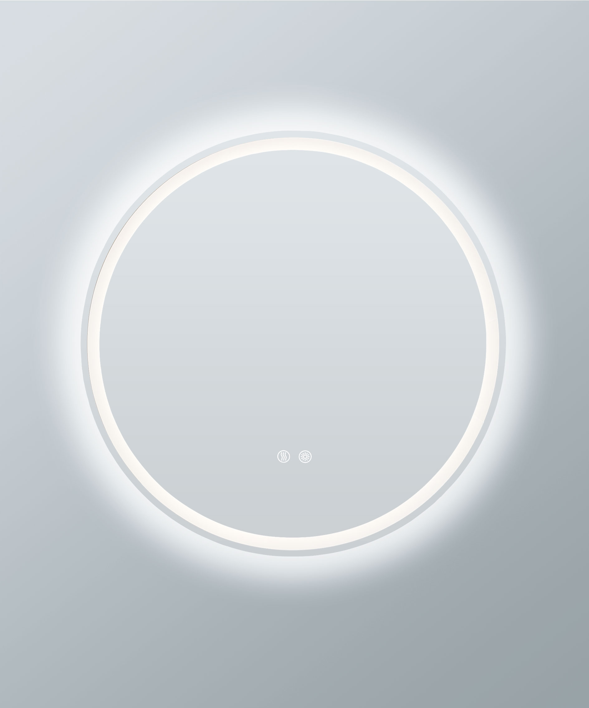 A circular mirror defined by a luminous ring that glows both inward and outward, creating a layered halo of light that softly embraces the surrounding wall.