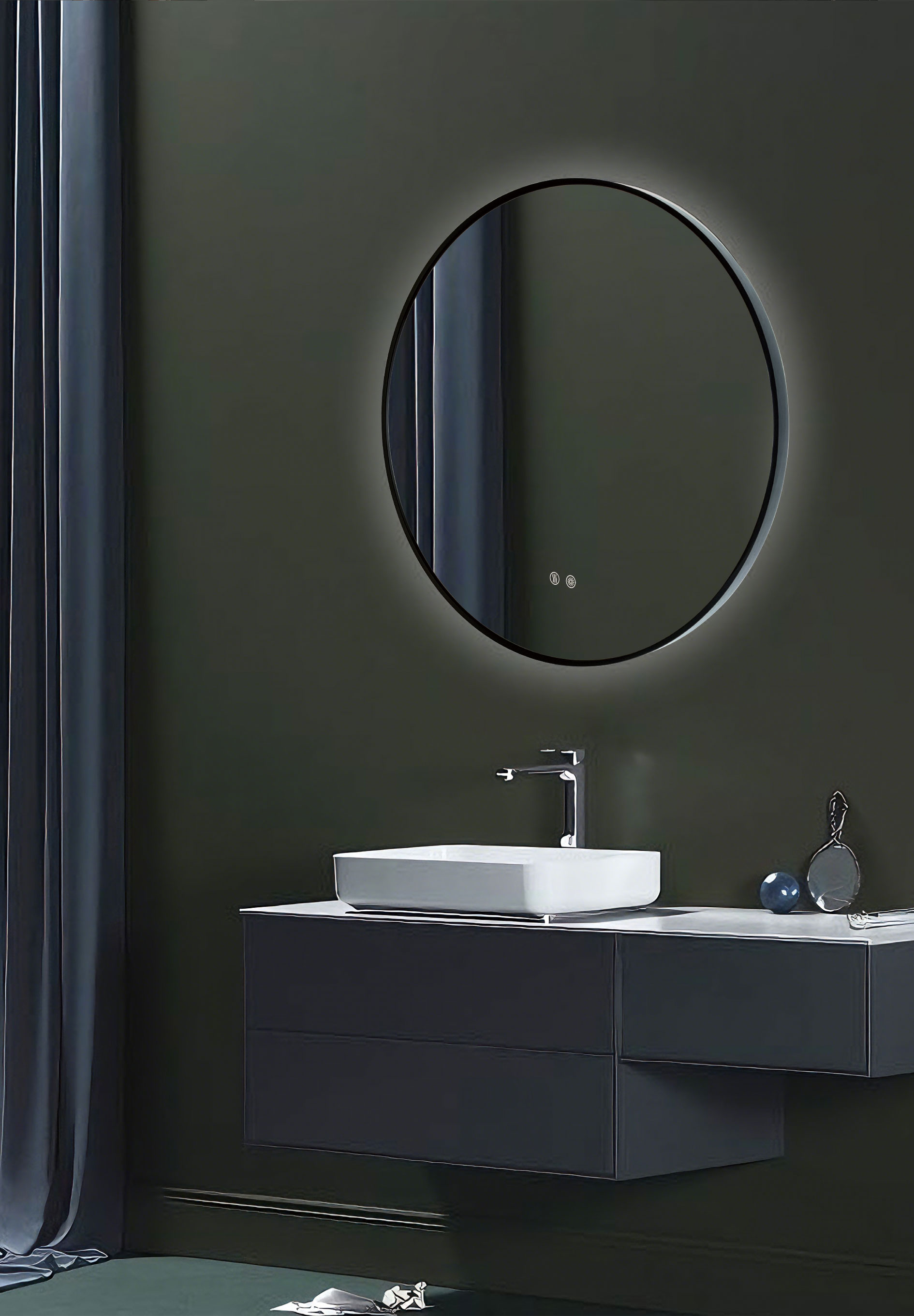 The gentle glow softens the edge and lifts the mirror subtly from the wall, creating a calm sense of depth.