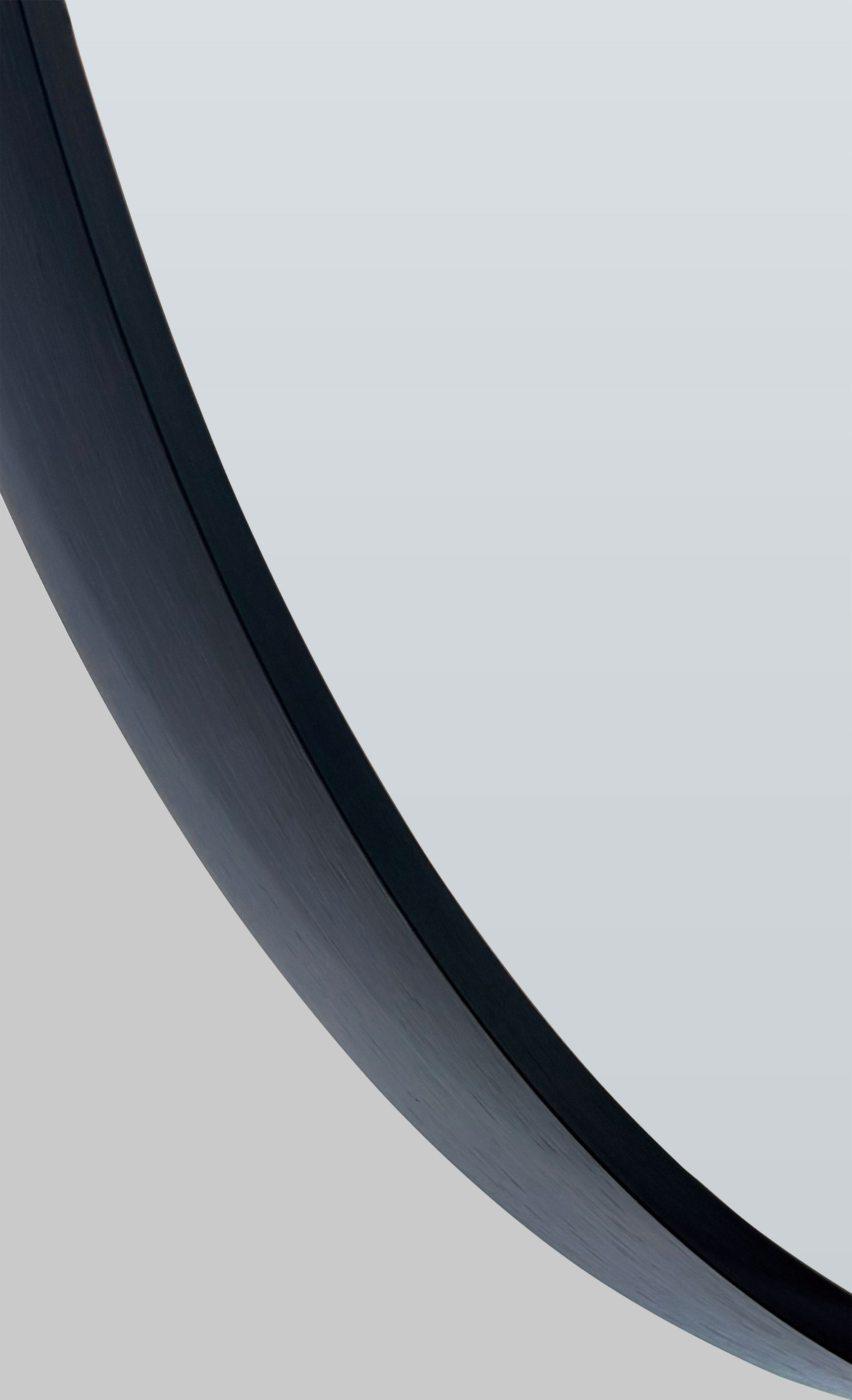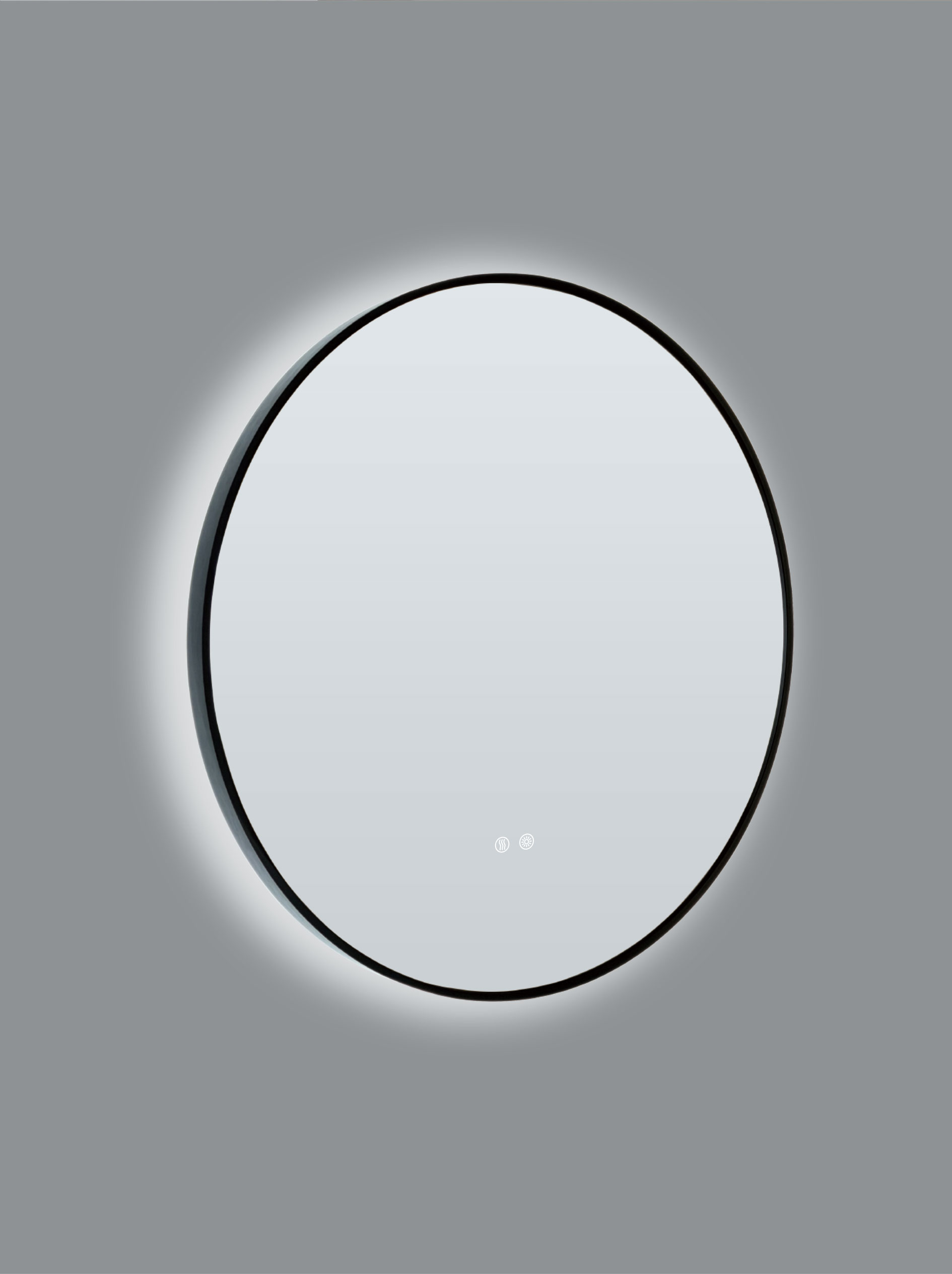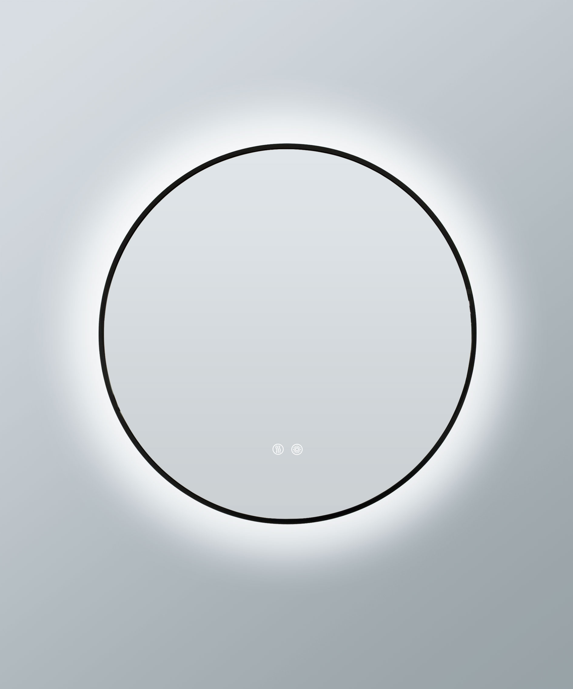 A circular mirror framed in smooth aluminum, defined by a quiet halo of backlight.