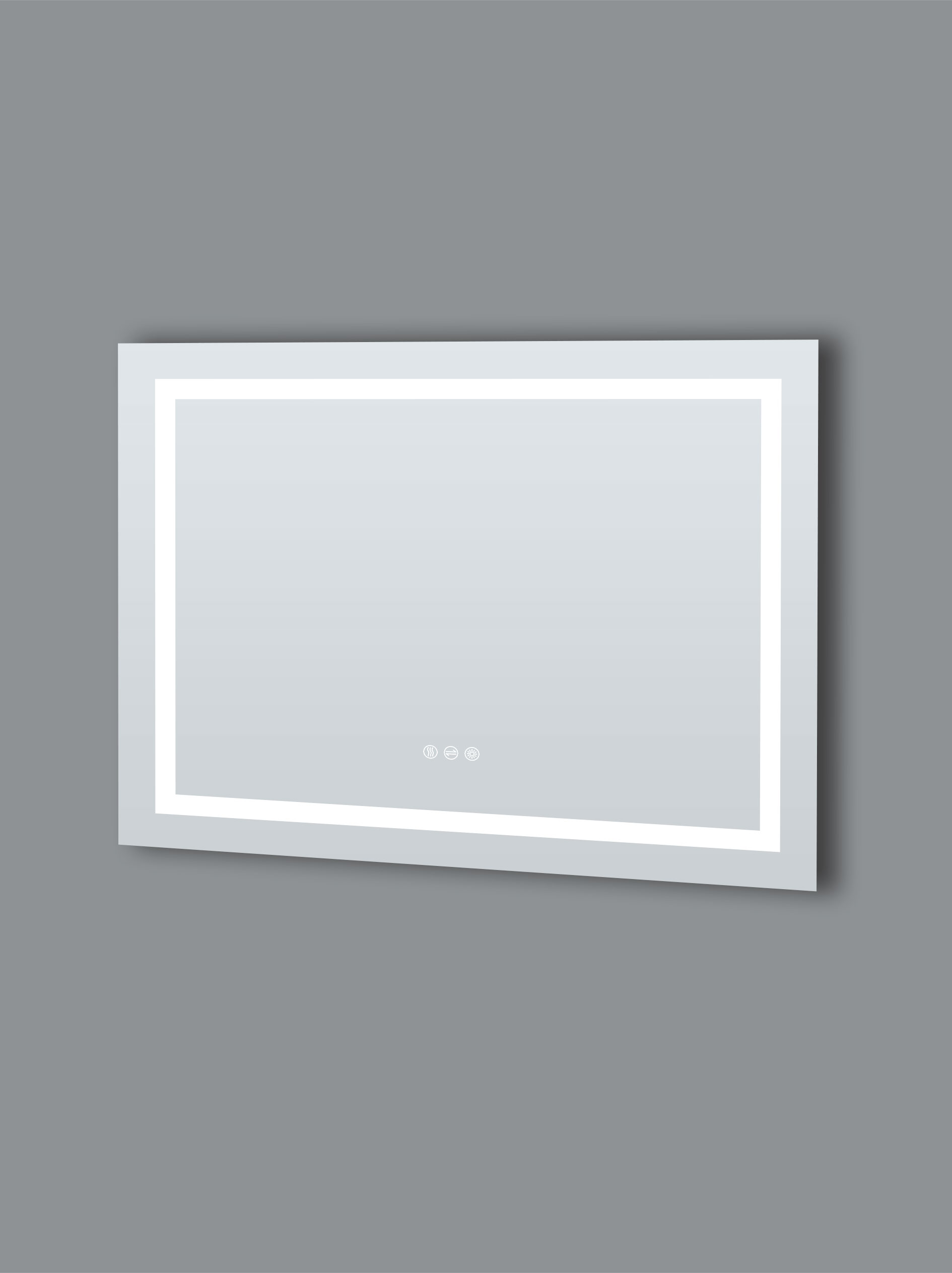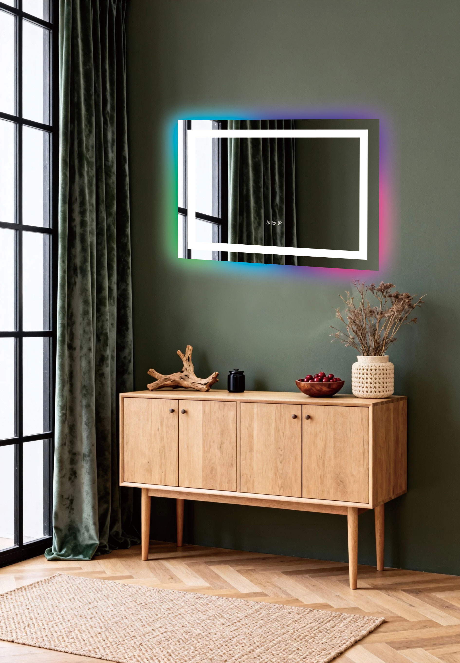 A rectangular mirror with sharp, confident edges, framed by two layers of light.