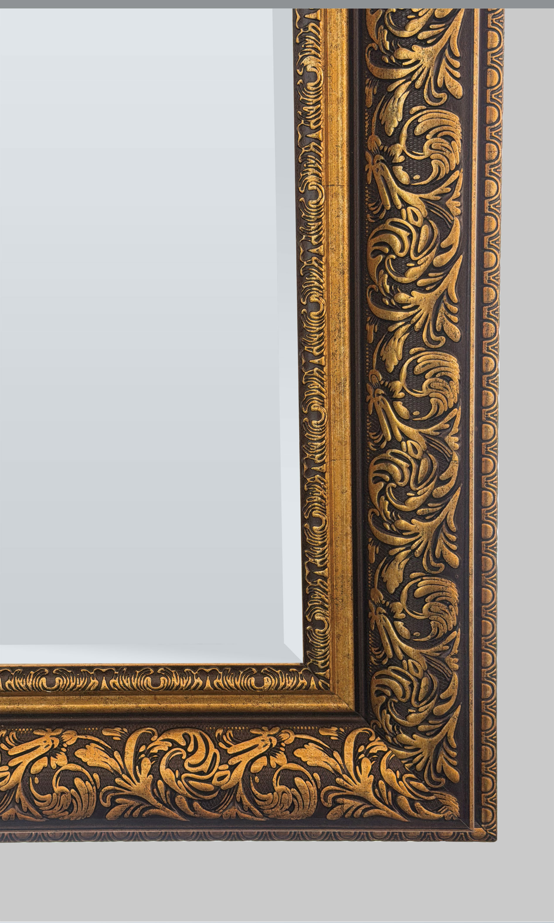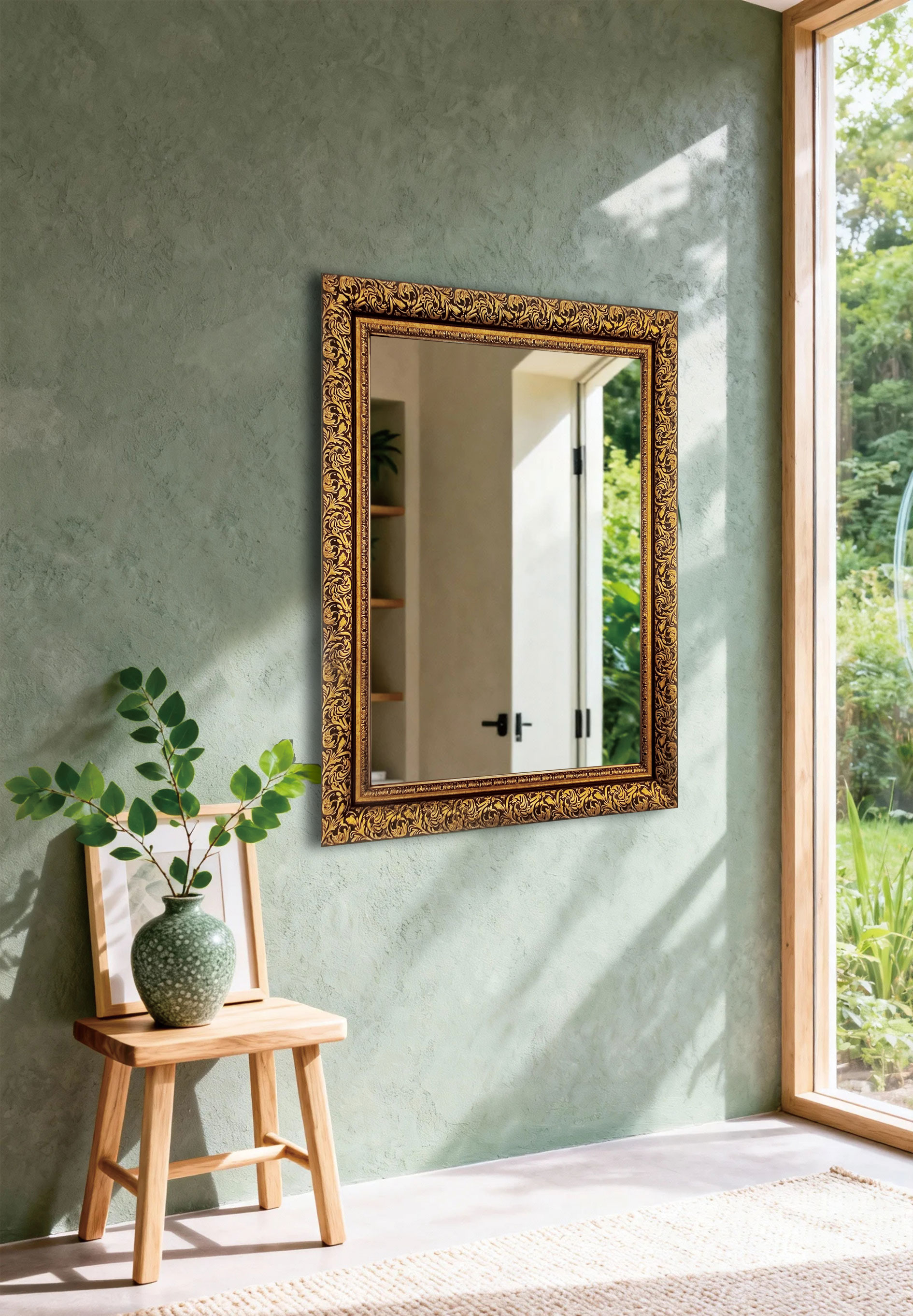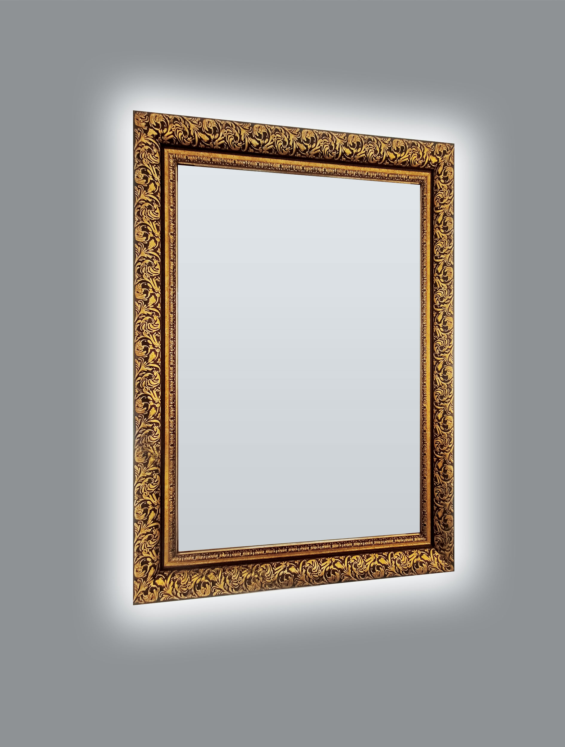 A rectangular mirror framed in an ornate European-style profile, where classic detailing meets soft ambient light.