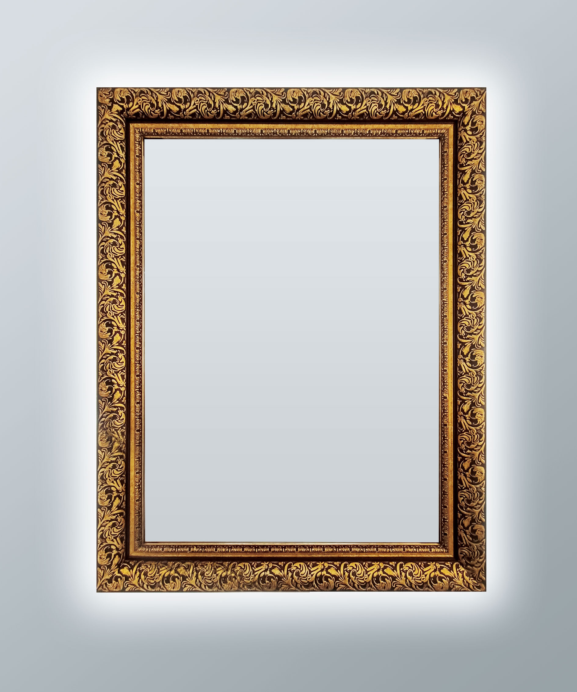 The sculpted frame adds depth and character, while the hidden backlight creates a gentle halo that lifts the mirror from the wall.
