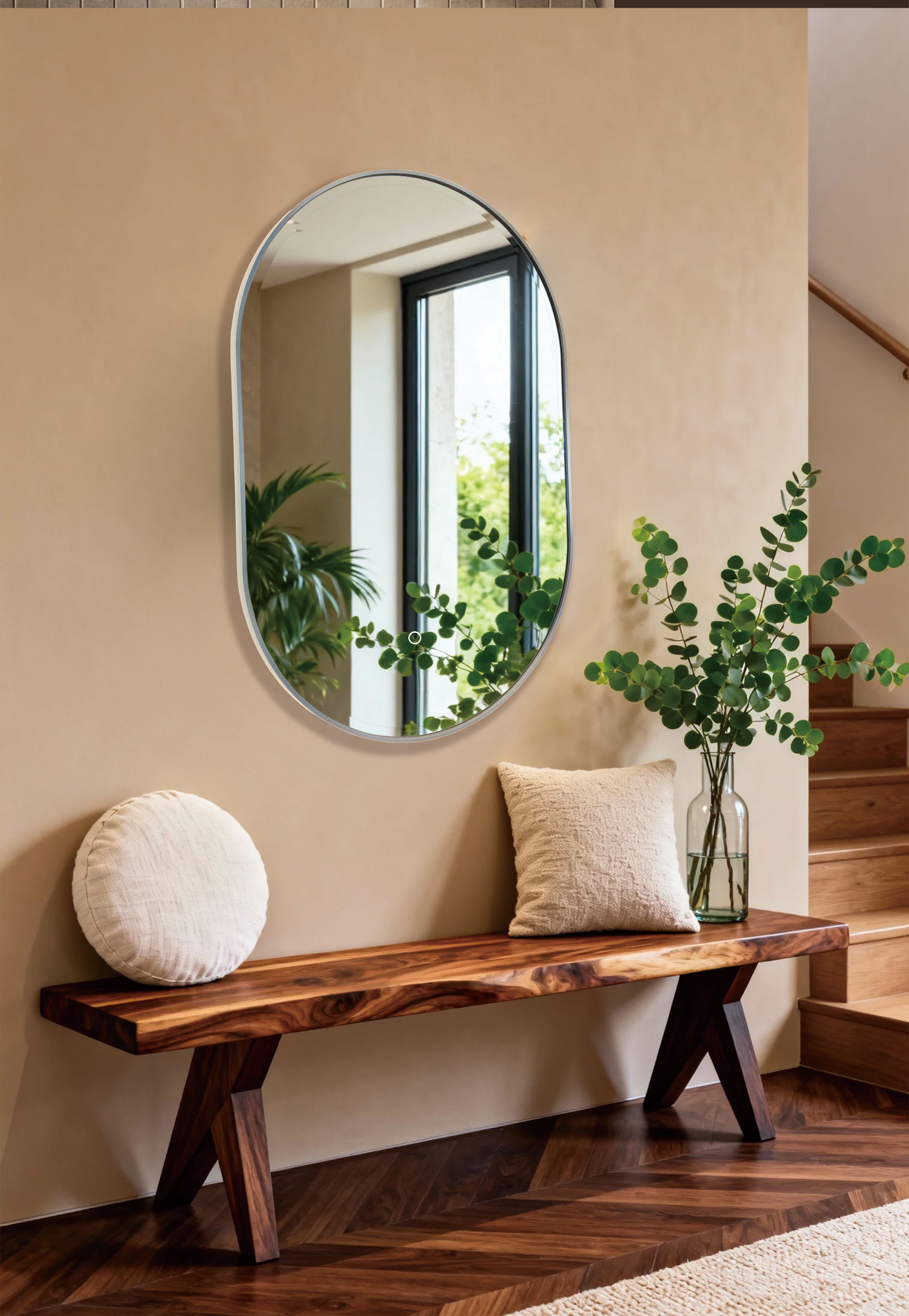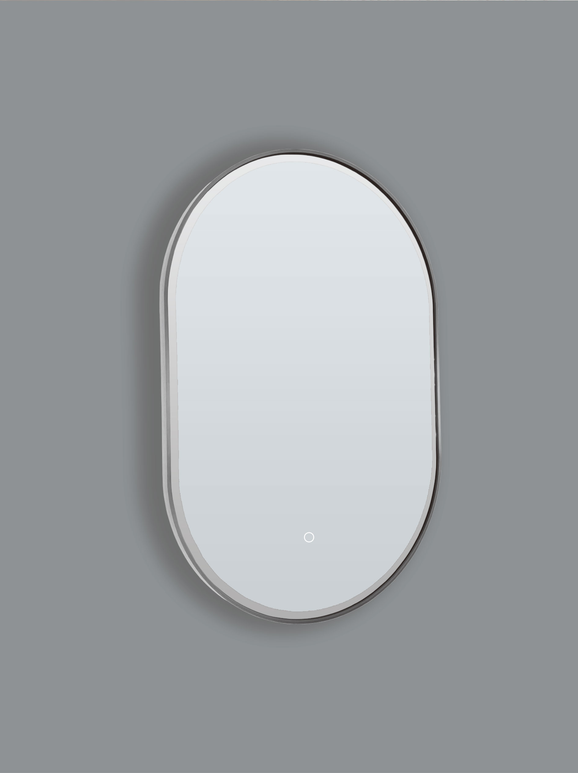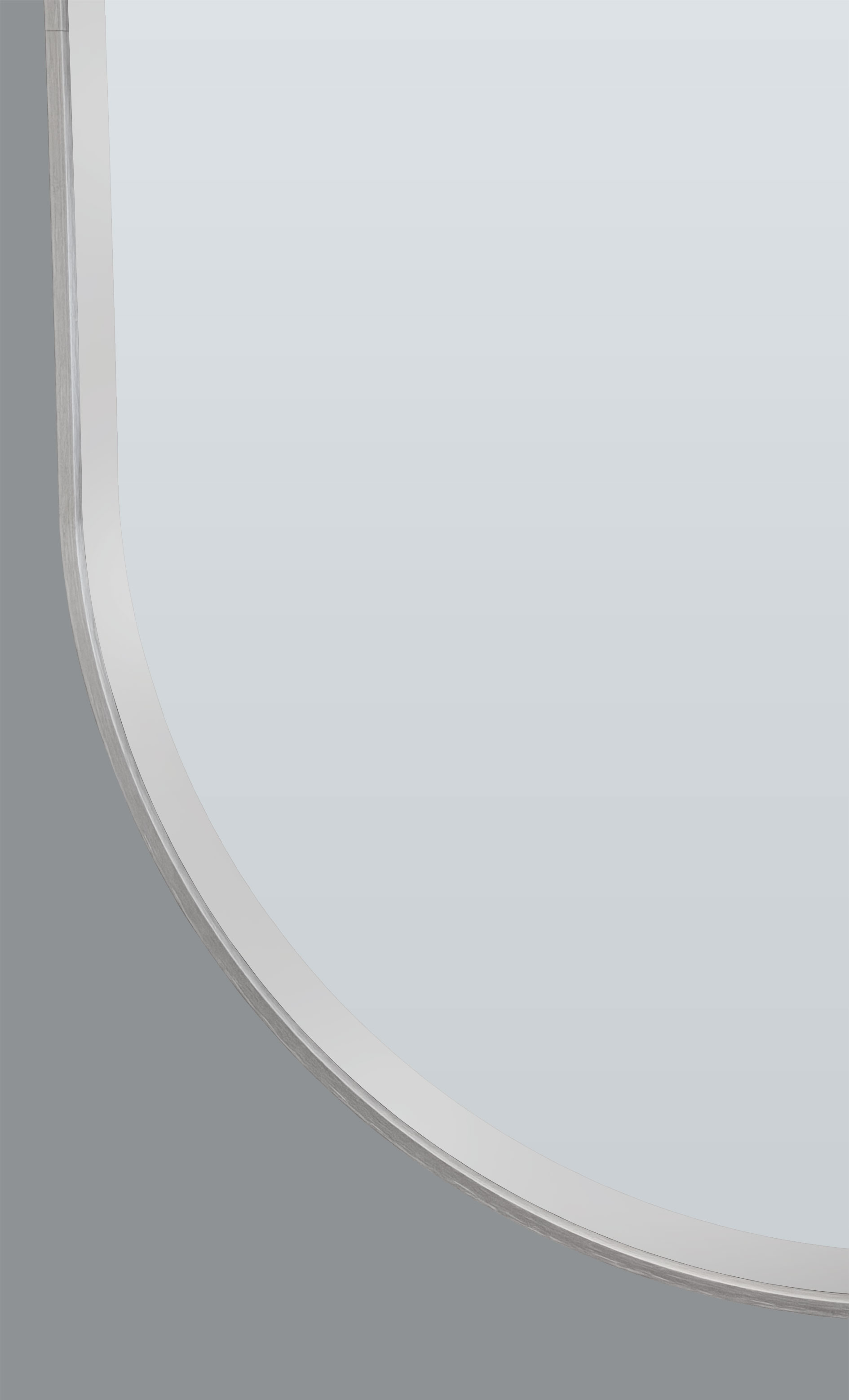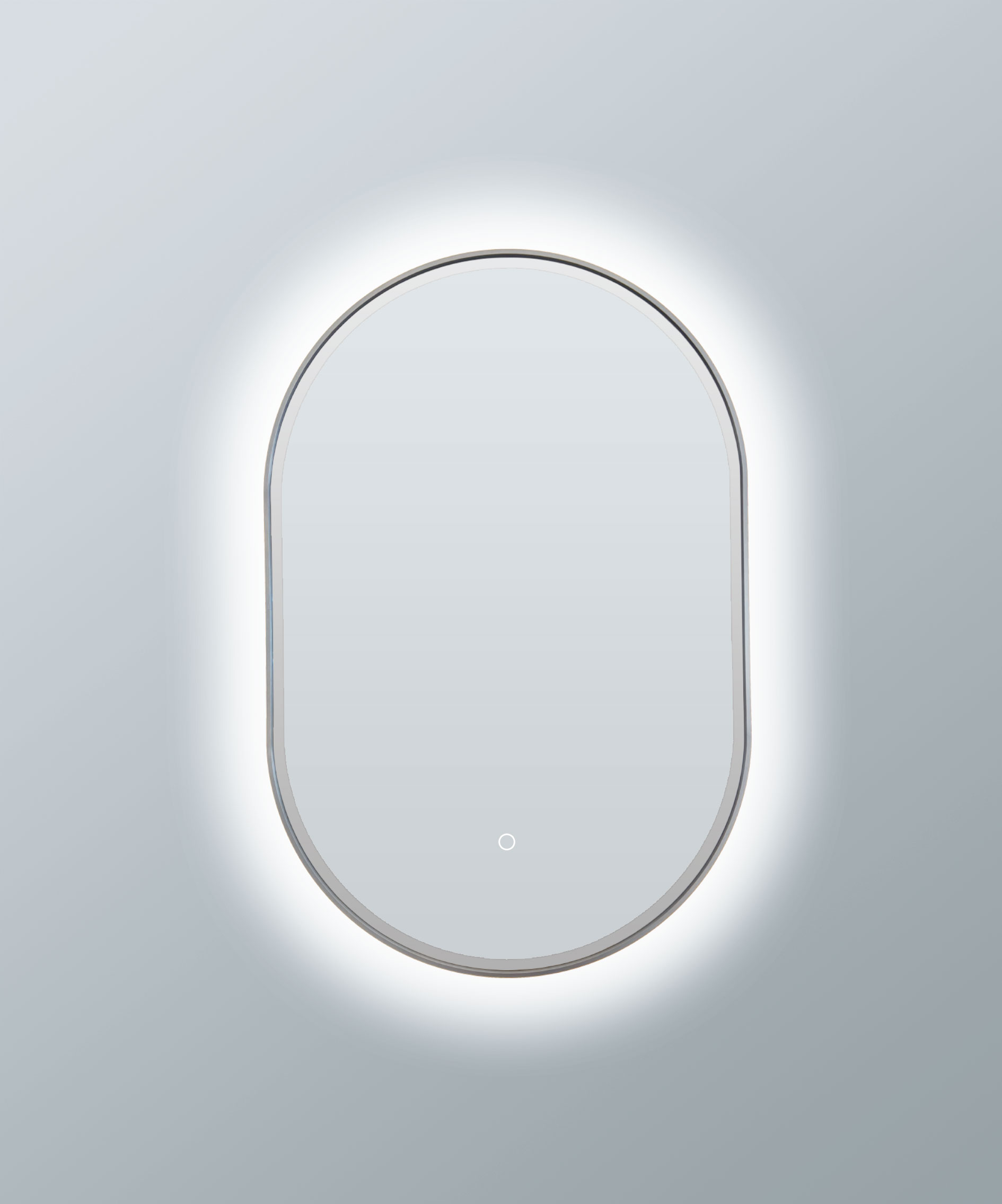 A racetrack-shaped illuminated mirror defined by gentle curves and quiet balance.